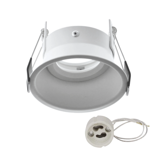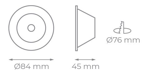 Aro empotrable fijo en color blanco con unas medidas de Ø84x55 milímetros, diseñado para la instalación de una bombilla LED dicroica GU10. Incluye portalámparas. Medida de corte: Ø76 milímetros.
