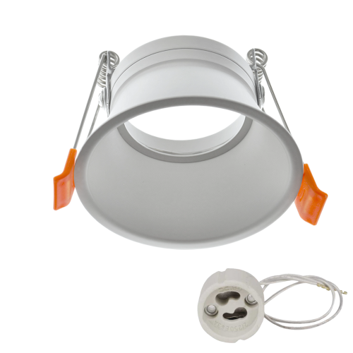 Aro empotrable fijo en color blanco con unas medidas de Ø84x55 milímetros, diseñado para la instalación de una bombilla LED dicroica GU10. Incluye portalámparas. Medida de corte: Ø76 milímetros.