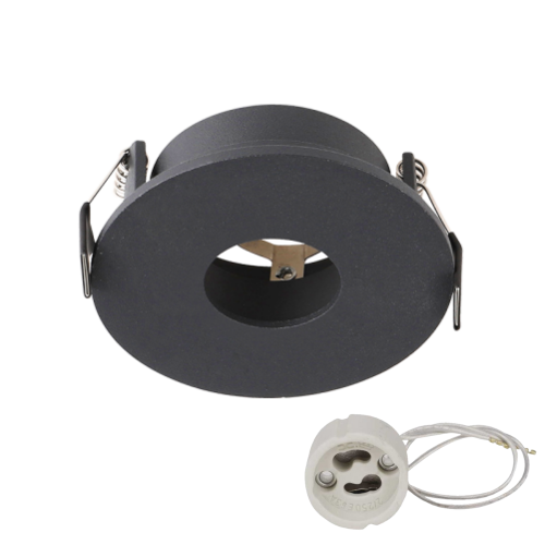 Aro empotrable fijo en color negro con unas medidas de Ø81x34 milímetros, diseñado para la instalación de una bombilla LED dicroica GU10. Incluye portalámparas. Medida de corte: Ø70 milímetros.