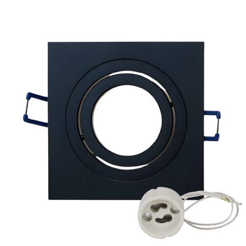 Aro empotrable basculante en color blanco con unas medidas de 92x92x28 milímetros, diseñado para la instalación de una bombilla LED dicroica GU10. Incluye portalámparas. Medida de corte: Ø75 milímetros.