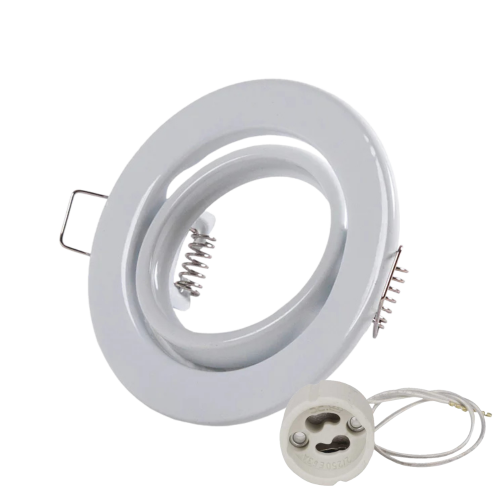 Aro empotrable redondo basculante diámetro en blanco con unas medidas de Ø103x35 milímetros, diseñado para la instalación de una bombilla LED dicroica GU10. Incluye portalámparas. Medida de corte: Ø78 milímetros.
