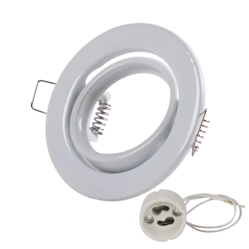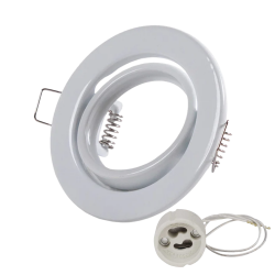 Aro empotrable basculante en blanco con unas medidas de Ø89x27 milímetros, diseñado para la instalación de una bombilla LED dicroica GU10. Incluye portalámparas. Medida de corte: Ø68 milímetros.