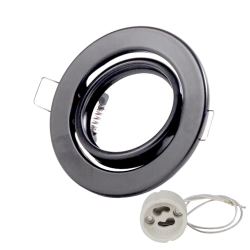 Aro empotrable basculante en negro con unas medidas de Ø89x27 milímetros, diseñado para la instalación de una bombilla LED dicroica GU10. Incluye portalámparas. Medida de corte: Ø68 milímetros.