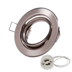 Aro empotrable basculante en níquel con unas medidas de Ø95x27 milímetros, diseñado para la instalación de una bombilla LED dicroica GU10. Incluye portalámparas. Medida de corte: Ø68 milímetros.