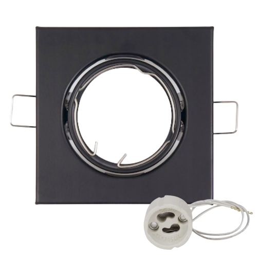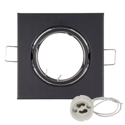 Aro cuadrado empotrable fijo en color negro con unas medidas de 85x85x35 milímetros, con medida de corte Ø80mm, su diseño polivalente permite la instalación de cualquier bombilla dicroica en GU10/MR16, así como cualquier SPOT con led integrado de Ø50mm.