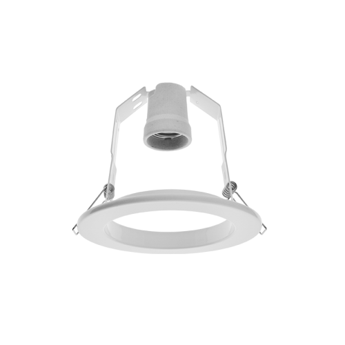 Aro empotrable redondo fijo para bombilla R63 con unas medidas de Ø105x115 milímetros fabricado en acero con acabado blanco. Incluye portalámparas. Medida de corte: Ø85 milímetros.