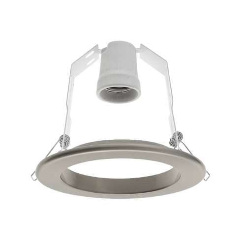 Aro empotrable redondo fijo para bombilla R80 con unas medidas de Ø125x120 milímetros fabricado en acero. Incluye portalámparas. Medida de corte: Ø105 milímetros.