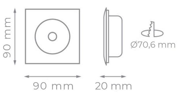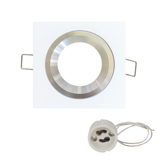 Empotrable cuadrado blanco con un difusor de aluminio en color plata. Cuenta con una medida exteriores de 90x90x20 milímetros y una medida de corte Ø70,6 milímetros. Compatible con bombillas GU10 y GU5.3.