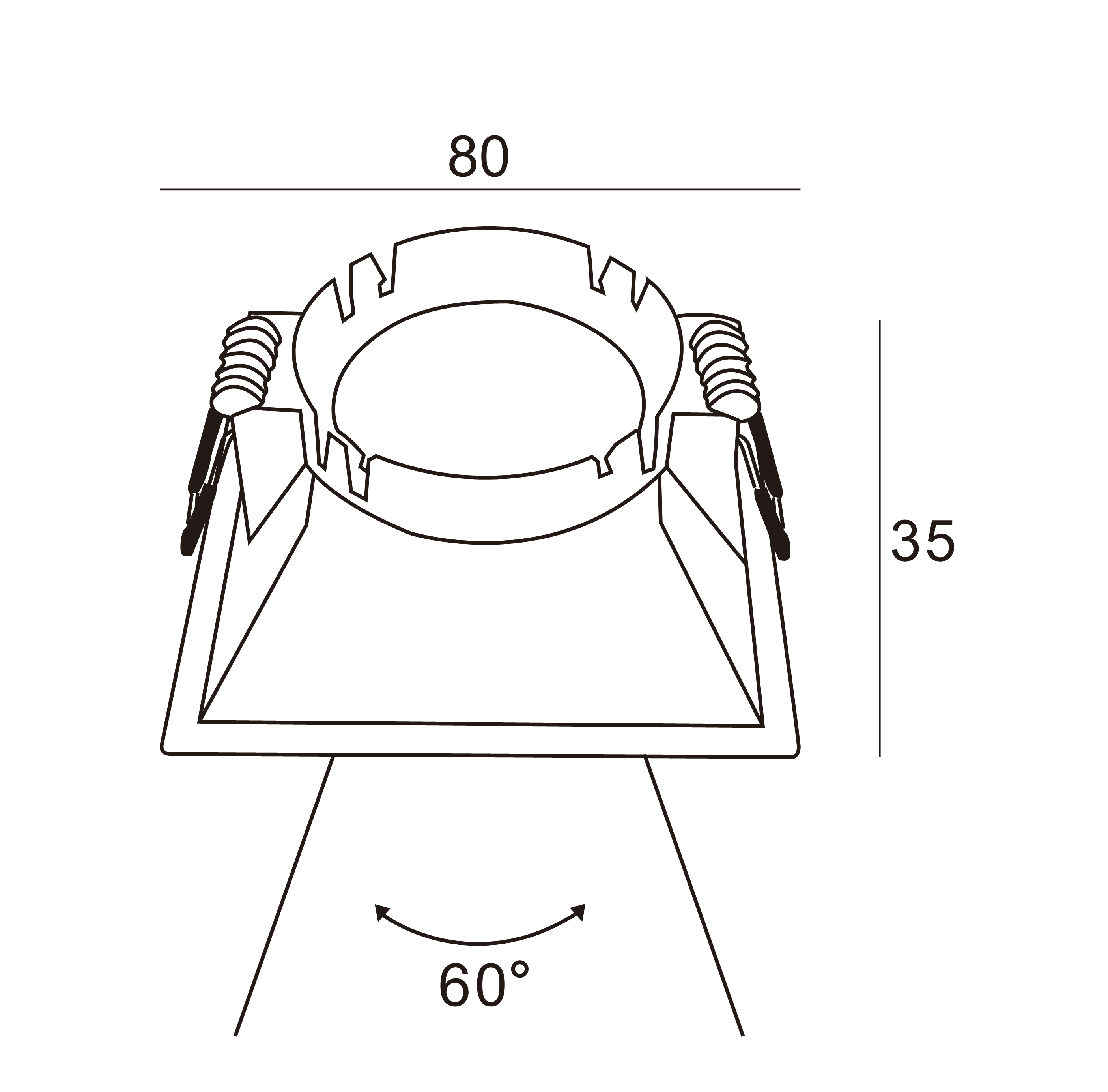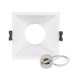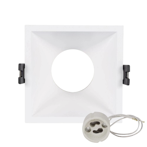 Aro cuadrado empotrable fijo en color negro con unas medidas de 85x85x35 milímetros, con medida de corte Ø80mm, su diseño polivalente permite la instalación de cualquier bombilla dicroica en GU10/MR16, así como cualquier SPOT con led integrado de Ø50mm.
