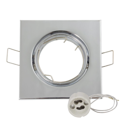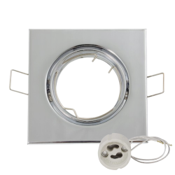 Aro empotrable basculante en níquel con unas medidas de 92x92x28 milímetros, diseñado para la instalación de una bombilla LED dicroica GU10. Incluye portalámparas. Medida de corte: Ø75 milímetros.