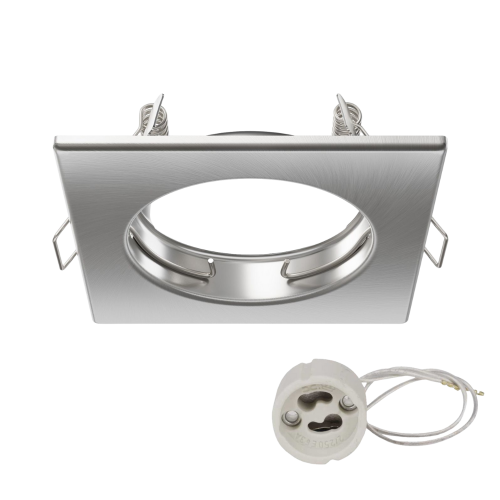 Aro empotrable basculante en níquel con unas medidas de 92x92x28 milímetros, diseñado para la instalación de una bombilla LED dicroica GU10. Incluye portalámparas. Medida de corte: Ø75 milímetros.