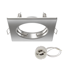 Aro empotrable basculante cuadrado en níquel con unas medidas de 82x82x29 milímetros, diseñado para la instalación de una bombilla LED dicroica GU10. Incluye portalámparas. Medida de corte: Ø65 milímetros.