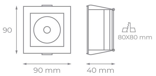 Mini cardan cuadrado fabricado en aluminio de color blanco con unas medidas de 90x90x40mm diseñado para la instalación de una bombilla LED GU10/MR16. Medida de corte: 80x80 mm.