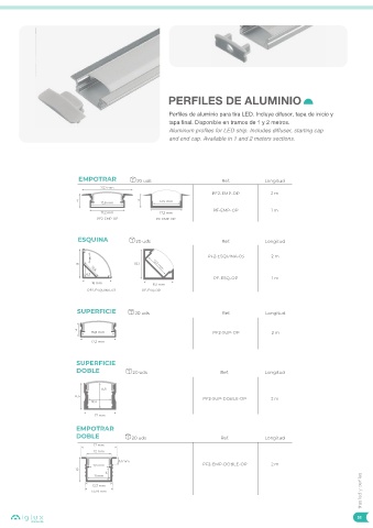 Perfiles de aluminio para tira LED. Incluye difusor, tapa de inicio y