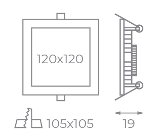 Downlight fabricado en aluminio y policarbonato en plata. Cuenta con un LED SAN'AN SMD 2835, unas medidas exteriores de 120x120x19mm y un corte de 105x105mm. Incluye driver LED Isolated.