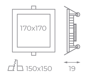 Downlight fabricado en aluminio y policarbonato en plata. Cuenta con un LED SAN'AN SMD 2835, unas medidas exteriores de 170x170x19mm y un corte de 150x150mm. Incluye driver LED Isolated.