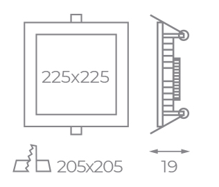 Downlight fabricado en aluminio y policarbonato en níquel. Cuenta con un LED SAN'AN SMD 2835, unas medidas exteriores de 225x225x19mm y un corte de 205x205mm. Incluye driver LED Isolated.