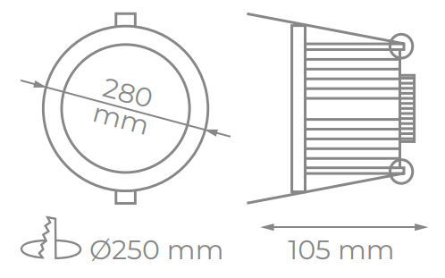Downlight de aluminio con difusor y aro de policarbonato en blanco. Dispone de tira LED Epistar SMD 2835, un ángulo de apertura de 80º, unas medidas exteriores de Ø280x105 mm y de corte Ø250 mm.