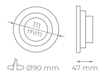 Downlight fabricado en policarbonato blanco, cuenta con un chip LED SAN'AN 2835, un ángulo de apertura de 120º con unas medidas externas de Ø111x47mm y una medida de corte Ø90mm. Luz fría.