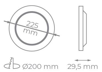 Downlight fabricado en aluminio y policarbonato en blanco. Cuenta con un LED SAN'AN SMD 2835, unas medidas exteriores de Ø225x19mm y un corte de 205Ømm. Incluye driver LED Isolated.
