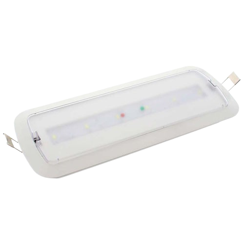 Luminaria LED de emergencia fabricada con un cuerpo de policarbonato en blanco y un difusor del mismo material. Cuenta con una potencia de 80 lúmenes, un ángulo de apertura de 120º y un IP43.
