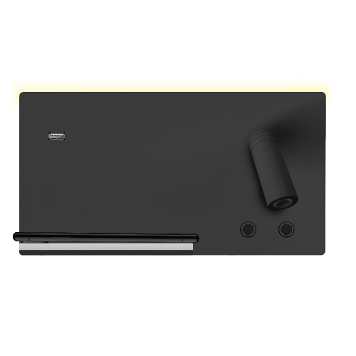 Aplique de dormitorio LED de aluminio lacado blanco o negro a izquierda, con luz de lectura direccionable , luz de ambiente superior, puerto USB y cargador inalámbrico. Incluye driver LED Isolated. | 50 uds.
