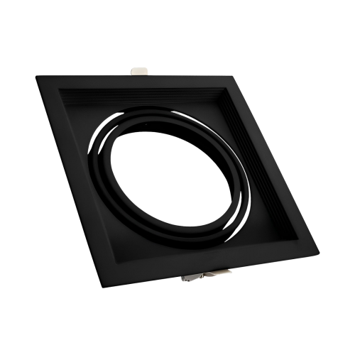 Cardan cuadrado simple fabricado en aluminio de color blanco con unas medidas de 185x185x43mm diseñado para la instalación de una bombilla LED AR111. Medida de corte: 165x165 mm. Giro 360º. Incluye 1 unidades + 1 portalámparas GU10