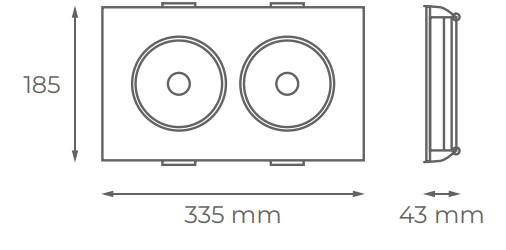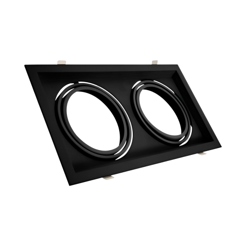 Cardan cuadrado doble fabricado en aluminio de color negro con unas medidas de 185x335x43mm diseñado para la instalación de una bombilla LED AR111. Medida de corte: 310x165 mm. Giro 360º. Incluye 1 unidades + 2 portalámparas GU10