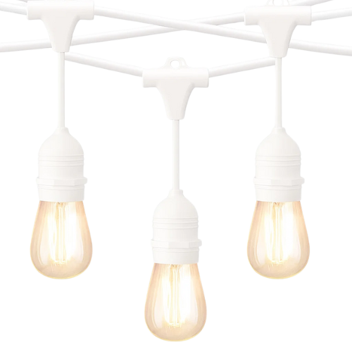Guirnalda para exterior con una longitud de 15 metros con 15 portalámparas en color blanca con un IP54. Posibilidad de conectar varias guirnaldas entre sí y compatible con la de 5M. Conector de tipo Schuko.