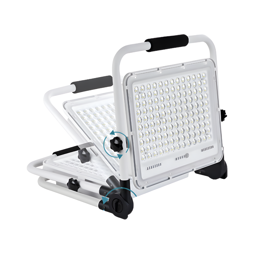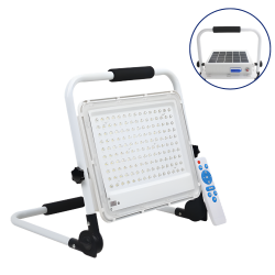 Proyector solar de 100w con batería de 3.2v/15000 mAh portátil de aluminio con mando a distancia de infrarrojos. Incluye panel solar de 6v/20V. Índice de protección IP65.