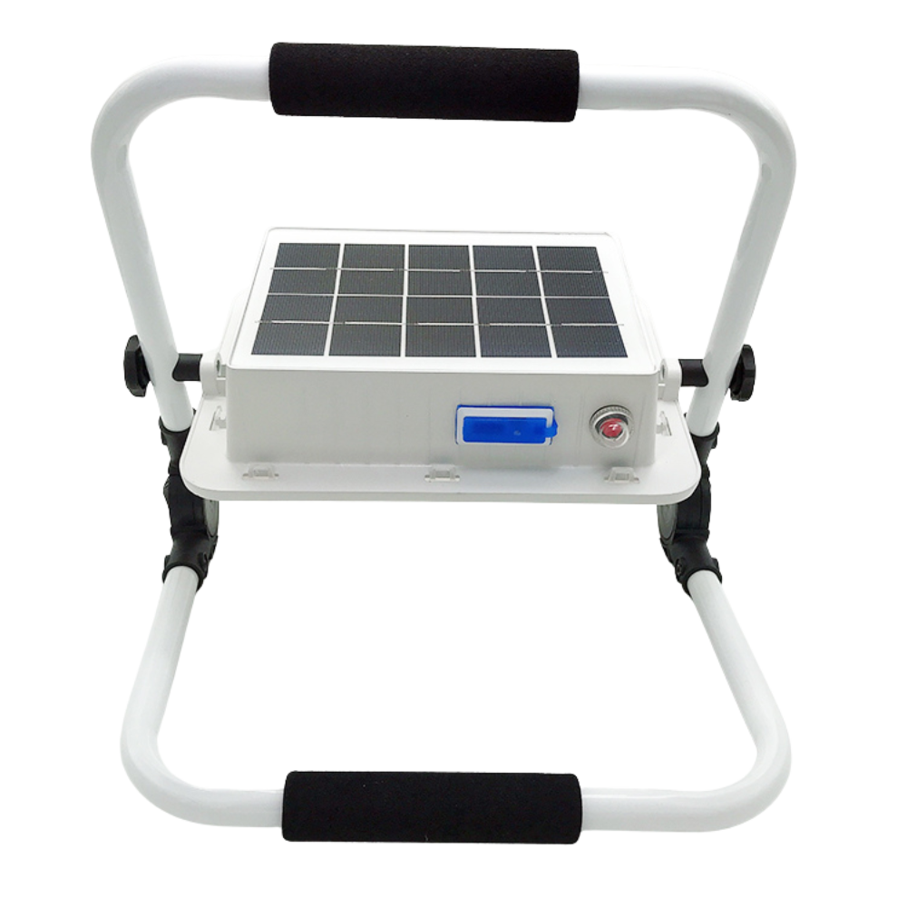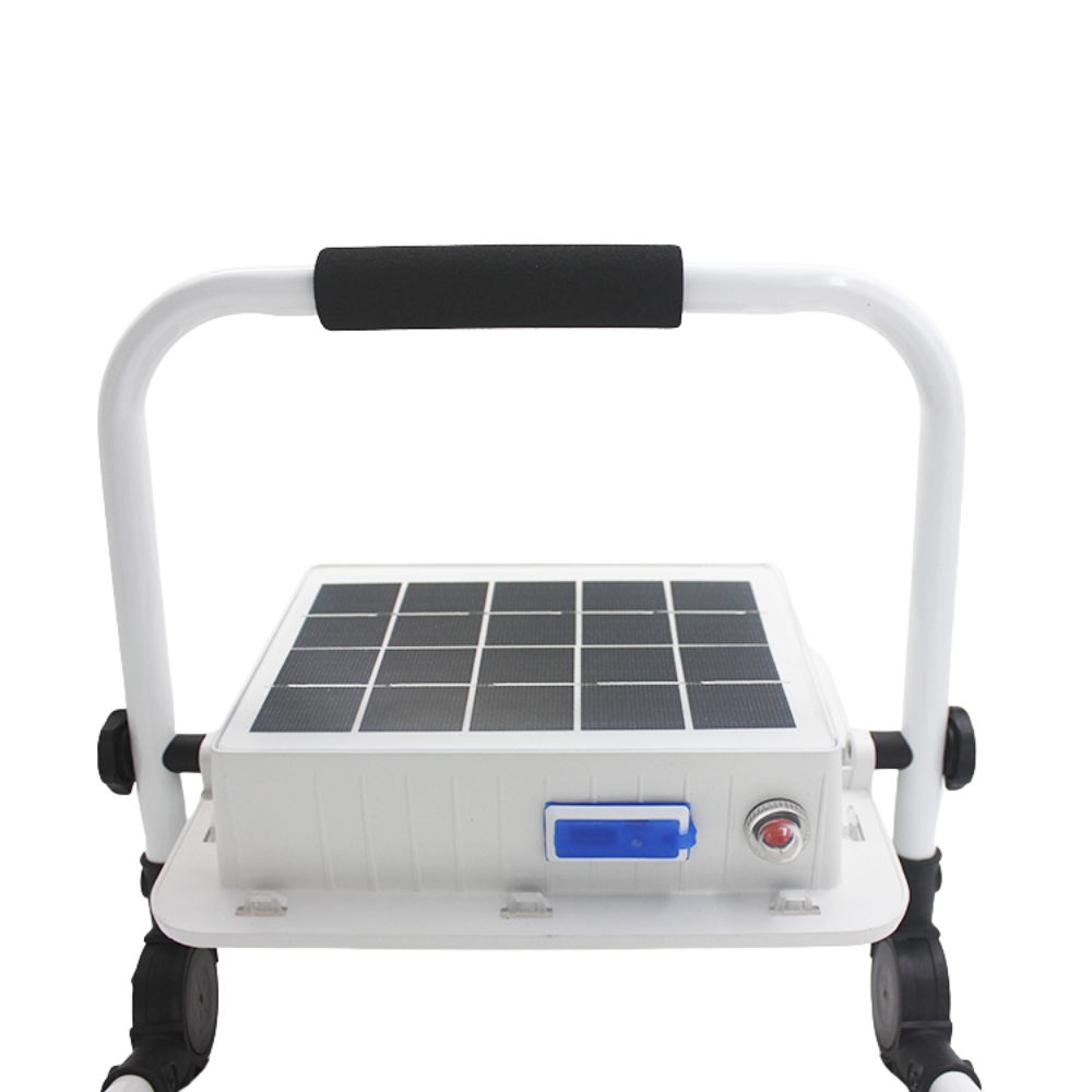 Proyector solar de 50w con batería de 3.2v/12000 mAh portátil de aluminio con mando a distancia de infrarrojos. Incluye panel solar de 6v/15V. Índice de protección IP65.