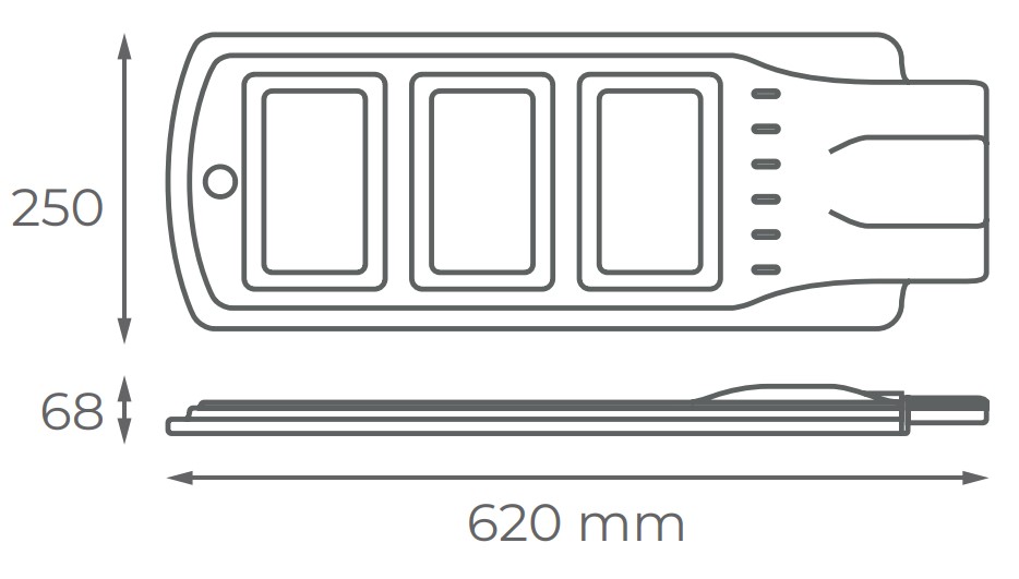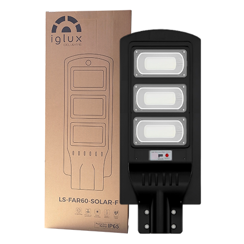 Farola LED solar fabricada en ABS, cuenta con una potencia de 60W 1500 lúmenes, un índice de protección IP65. Incluye mando infrarrojos. Compatible con mástil de Ø40-60 de diámetro.