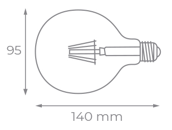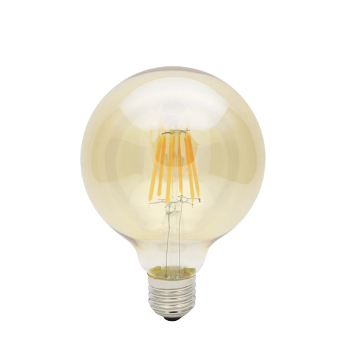Bombilla LED de filamento cristal ámbar en formato globo con casquillo E27, con una potencia de 4W 320 lúmenes. Dispone de unas medidas de Ø95x140 milímetros, un CRI>80,un ángulo de apertura de 360º y FP>0,6. Luz cálida.