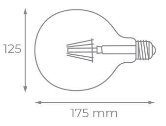 Bombilla LED de filamento cristal ámbar en formato globo con casquillo E27, con una potencia de 4W 320 lúmenes. Dispone de unas medidas de Ø125x175 milímetros, un CRI>80,un ángulo de apertura de 360º y FP>0,6. Luz cálida.