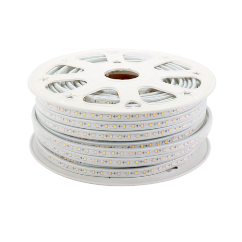 Tira LED 220V 9W/m 900 lúmenes 6000ºK para exterior en rollo de 50 metros. No sumergible. Corte cada metro, necesita conector con rectificador de corriente con conexión rápida. Longitud máxima por tramo 50 metros. Precio válido para tramos de metro.